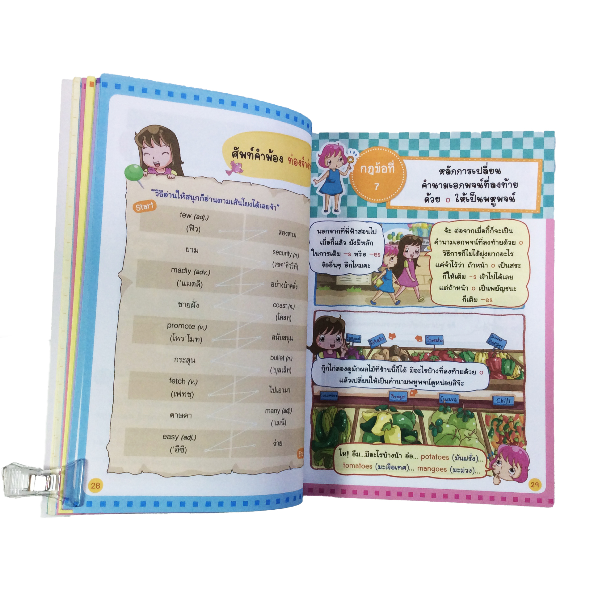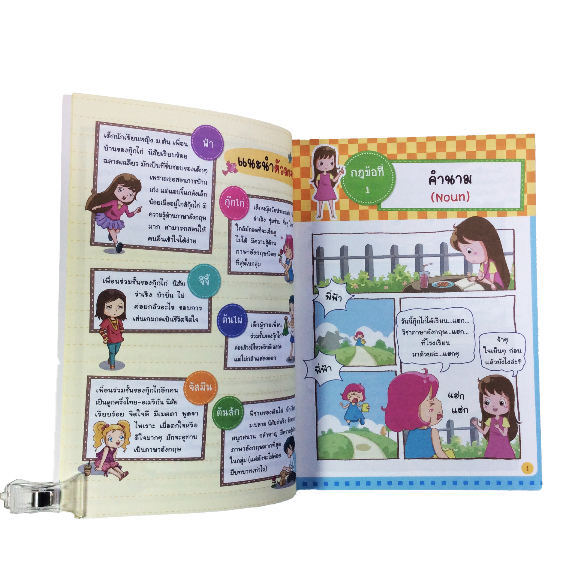 สรุปเนื้อหาสำคัญที่ควรรู้เกี่ยวกับหลักไวยากรณ์ภาษาอังกฤษ สำหรับนักเรียนระดับชั้นประถมศึกษา นำเสนอในรูปแบบการ์ตูนน่ารัก สีสันสวยงาม น้องๆ จะได้เรียนรู้ไวยากรณ์ภาษาอังกฤษผ่านการสนทนาโต้ตอบระหว่างตัวละครหลัก อาทิ ฟ้า กุ๊กไก่ จีจี้ จัสมิน ต้นไผ่ ต้นสัก โดยหยิบยกเรื่องราวต่างๆ ในชีวิตประจำวันมา สอดแทรกความรู้เกี่ยวกับกฎไวยากรณ์ ซึ่งจะช่วยให้น้องๆ จดจำและซึมซับไวยากรณ์ได้อย่างเป็นธรรมชาติและเข้าใจอย่างอัตโนมัติ นอกจากนี้ยังมีเกร็ดน่ารู้ต่างๆ เกี่ยวกับกฎไวยากรณ์ เพื่อเสริมความเข้าใจยิ่งขึ้น สำหรับน้องๆ ที่เตรียมตัวสอบภาษาอังกฤษสามารถฝึกทำแบบฝึกหัดท้ายบท เพื่อทบทวนความรู้สำหรับเตรียมสอบได้อย่างมั่นใจ รูปประกอบสวยงามสดใส พิมพ์ 4 สีทั้งเล่ม